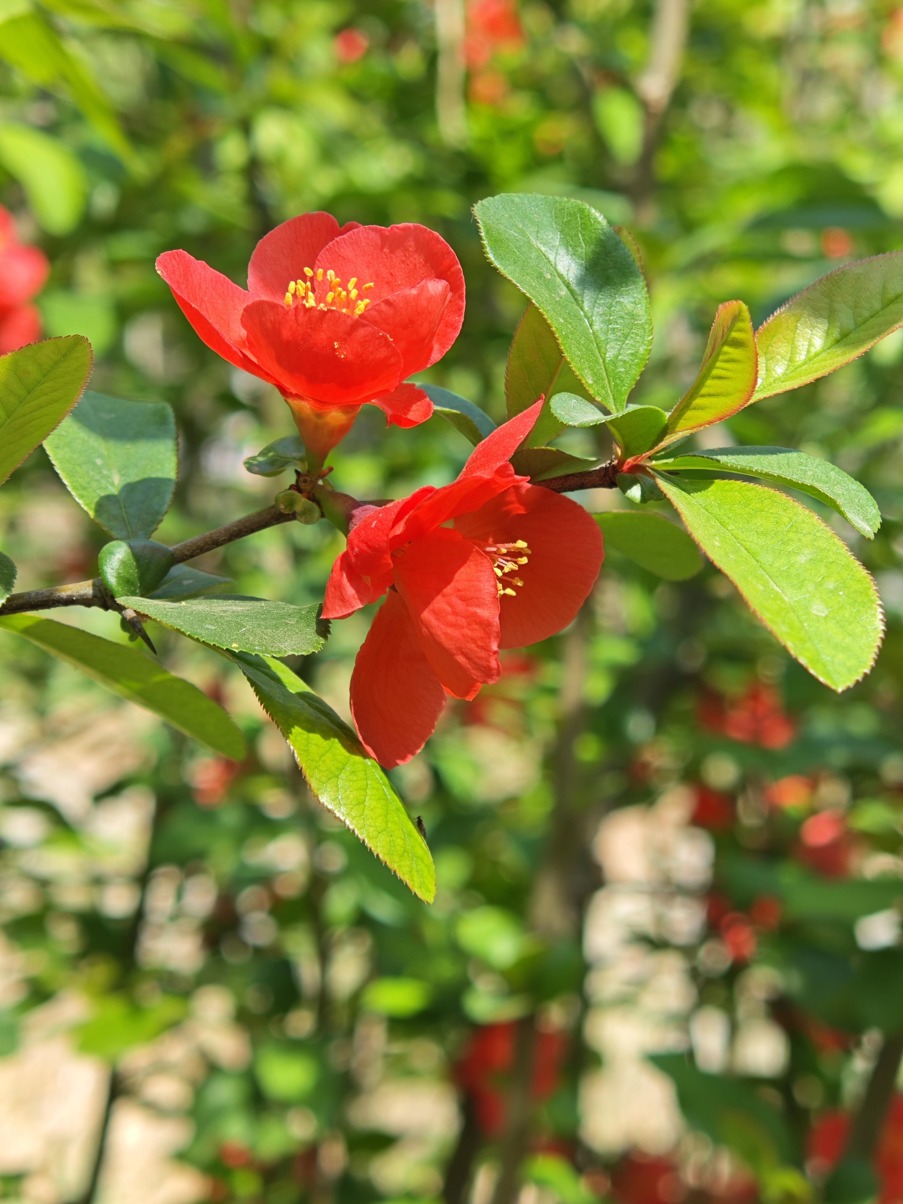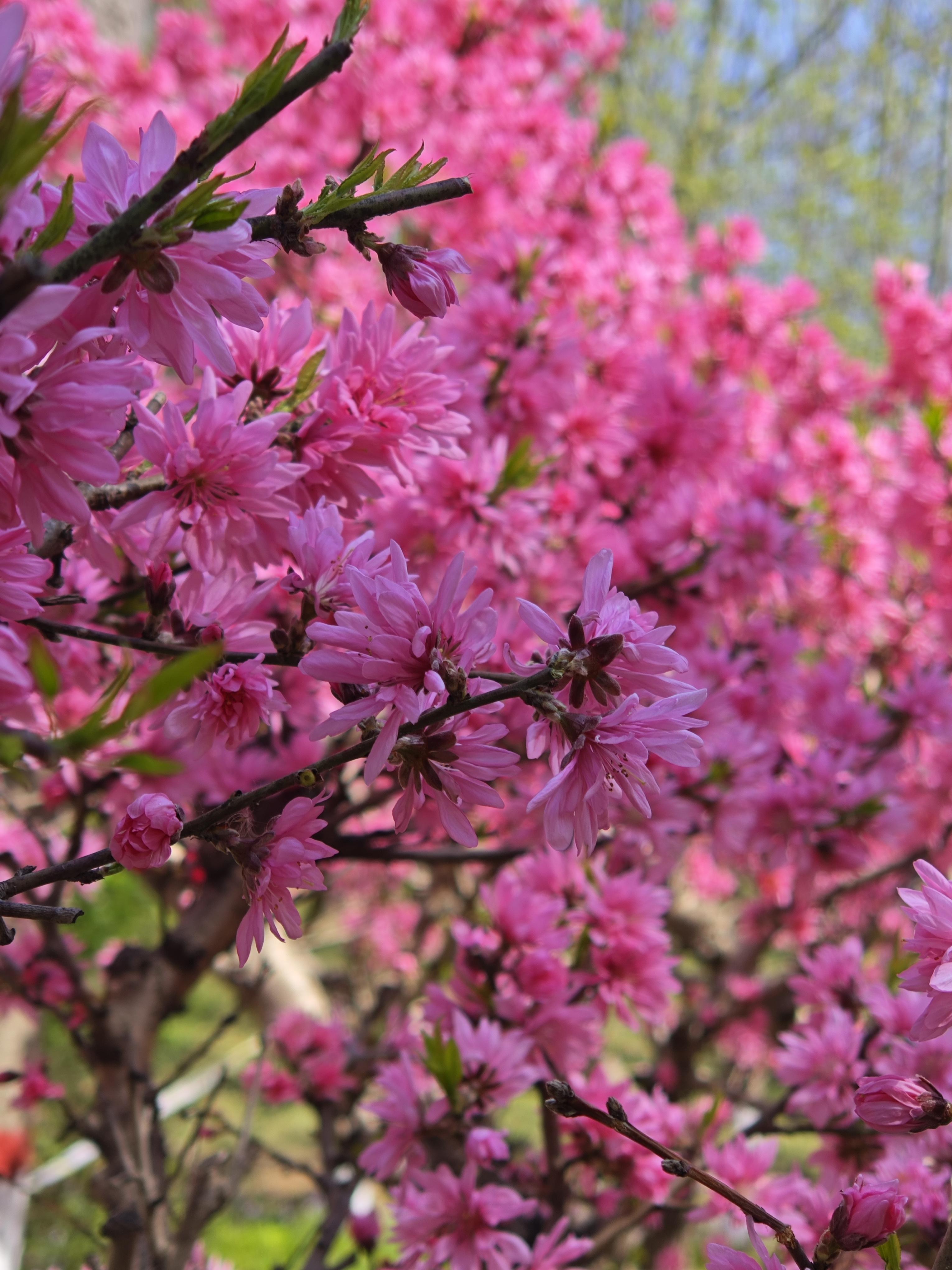 开始,以为是菊花桃,但花瓣较小更紧密。查询了一下,名叫紫荆花,又叫做“满条红”。和香港“紫荆花”同名却不是同一种,香港市花名叫“洋紫荆”。
