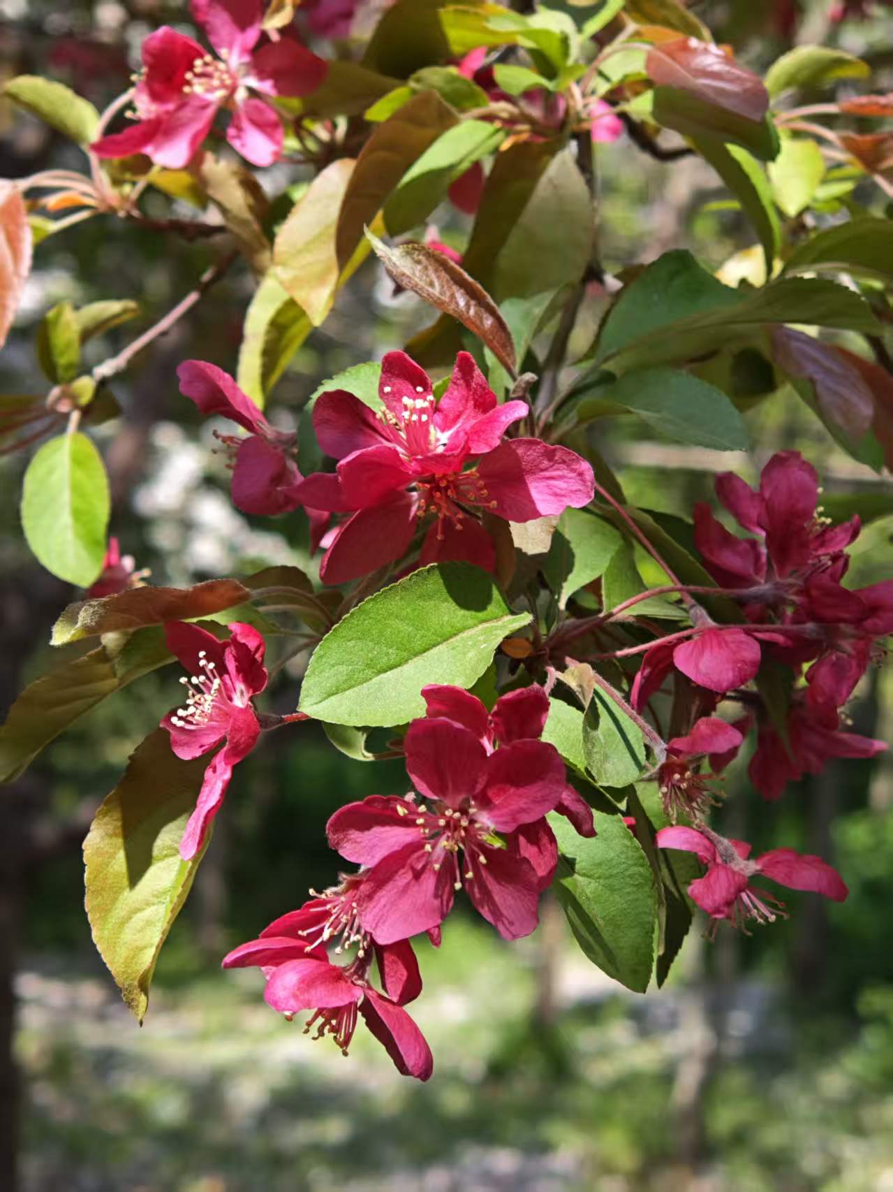 往年,注意力都在西府海棠身上,进了植物园也只在那粉白的花前流连,没想到园内竟然还有几株如碧桃一般的艳丽花卉。