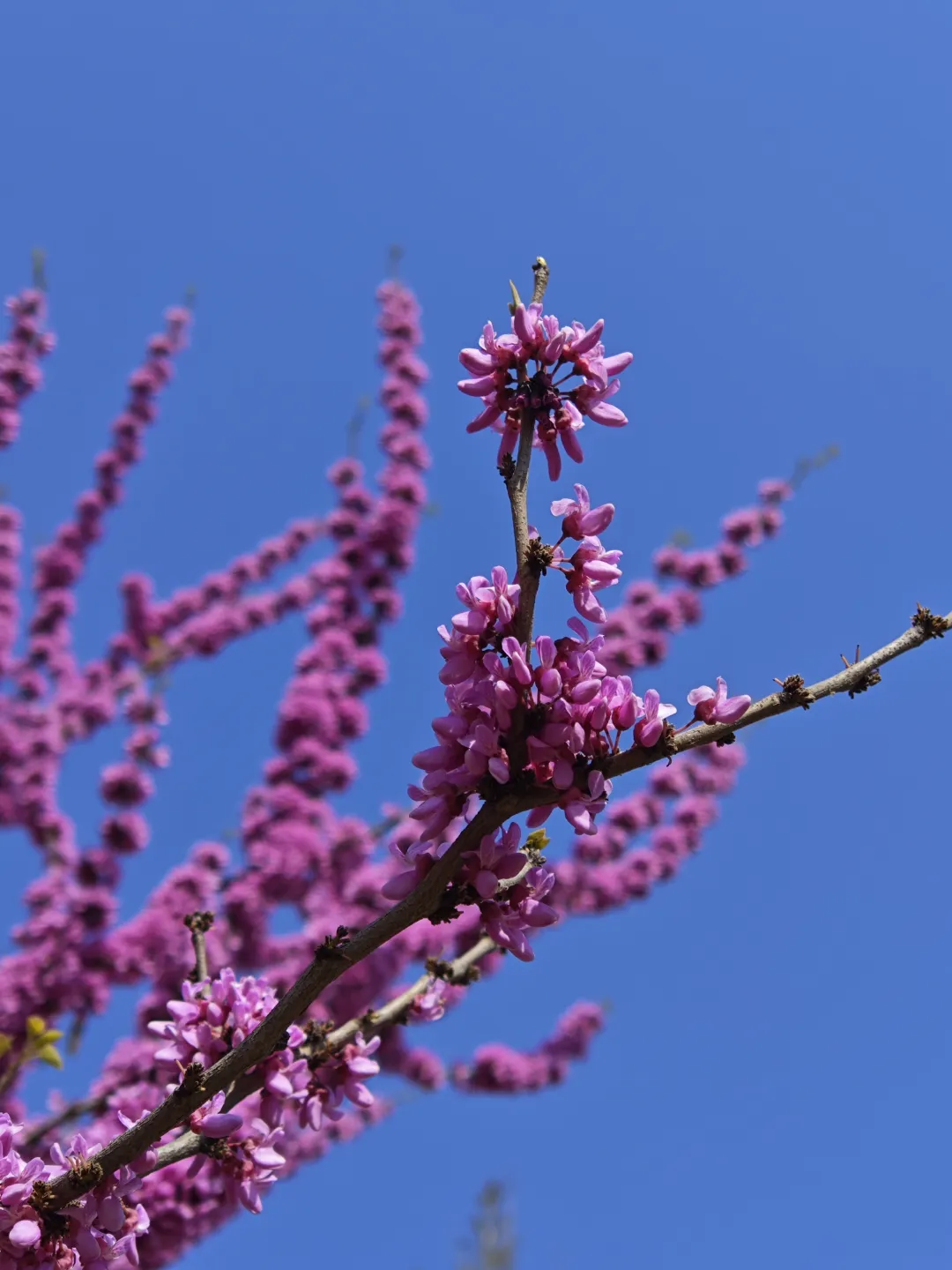 这种紫荆花,花不只是开在新枝上,连粗壮的老枝、主干上都能开花。每一条枝条开都得密不透风。紫荆在传统文化里是“兄弟和睦”的象征,寓意家庭团圆、手足情深。