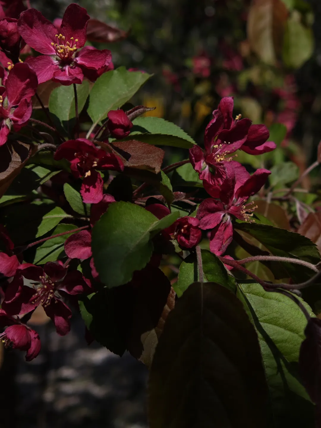 问了豆包才知道,这就是北美海棠。市区西边的几条南北方向的道路两旁植着不少北美海棠,但从没凑近了看,所以花瓣形状并不清楚。远远地瞅上一眼,只觉得花的颜色沉郁,看上去不大干净,不如西府海棠那般干净明媚。
